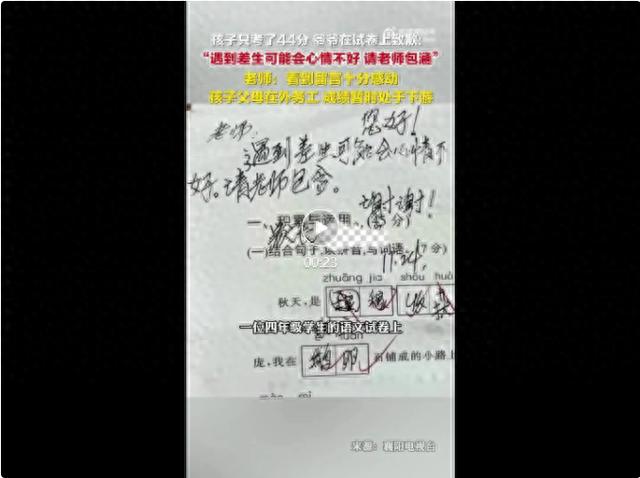 湖北宜城一位爺爺,在孫子44分的試卷上寫(xiě)下的幾句話,讓老師心里暖烘烘的。這事兒不大,卻在網(wǎng)上傳開(kāi)了,戳中了不少人的心窩子。